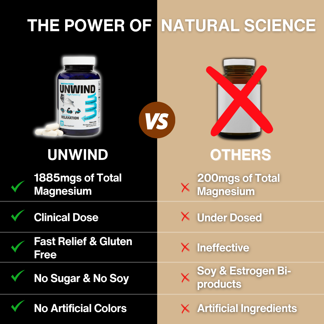 UNWIND is unique, it provides 400mg of ELEMENTAL MAGNESIUM, out of 1885mg of TOTAL MAGNESIUM. The Elemental Magnesium is the important number, if your current Magnesium doesn't tell you how much of that is inside, DON'T TAKE IT! UNWIND also provides a full dosage of Shilajit, Lemon Balm Extract and Ginger Root.