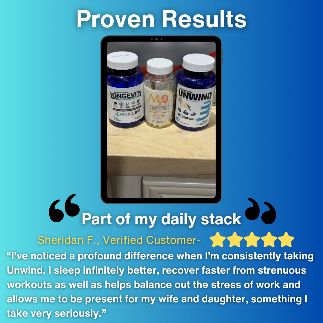 I’ve noticed a profound difference when I’m consistently taking Unwind. I sleep infinitely better, recover faster from strenuous workouts as well as helps balance out the stress of work and allows me to be present for my wife and daughter, something I take very seriously.