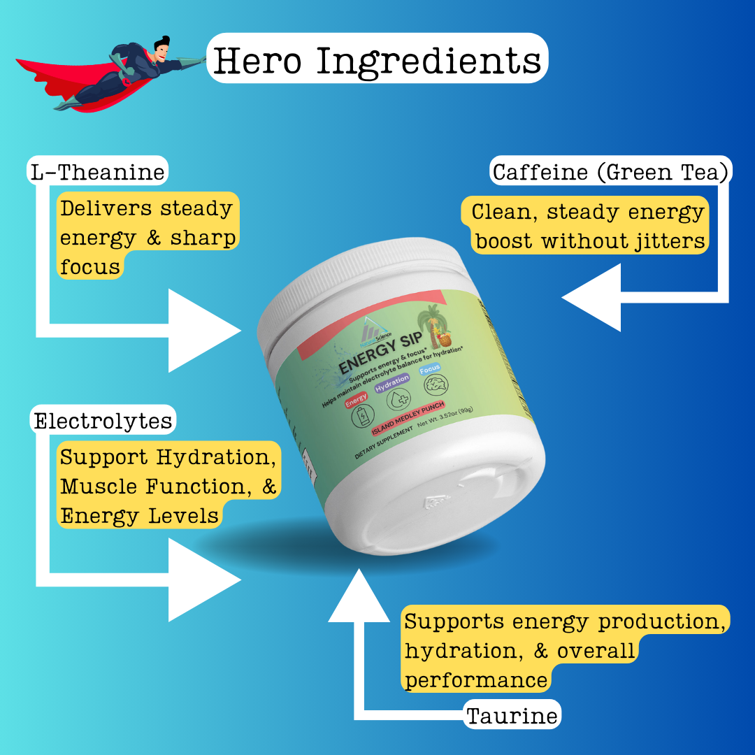Absolutely! Energy Sip is perfect for fueling workouts, gaming sessions, studying, or long workdays. The formula combines energy-supporting nutrients, electrolytes for hydration, and ingredients like caffeine and B vitamins to keep your body and mind performing at their best.