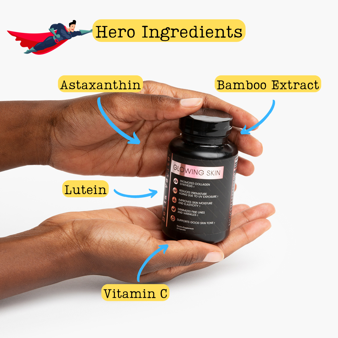 Glowing Skin is a plant-based collagen booster. It supports your body's natural collagen production using superfood ingredients like bamboo extract, astaxanthin, and lutein.