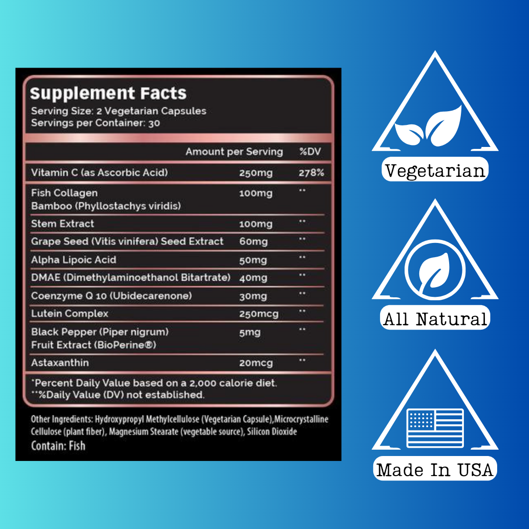 Vitamin C (as Ascorbic Acid), Collagen Bamboo (Phyllostachys viridis) Stem Extract, Grape Seed (Vitis vinifera) Extract, Alpha Lipoic Acid, DMAE (Dimethylaminoethanol Bitartrate), Coenzyme Q 10 (Ubidecarenone), Lutein Complex, Black Pepper (Piper nigrum) Fruit Extract (BioPerine), Astaxanthin, Hydroxypropyl Methylcellulose (Vegetariant Capsule), Microcrystalline Cellulose (plant fiber), Magnesium Stearate (vegetable source), Silicon Dioxide.