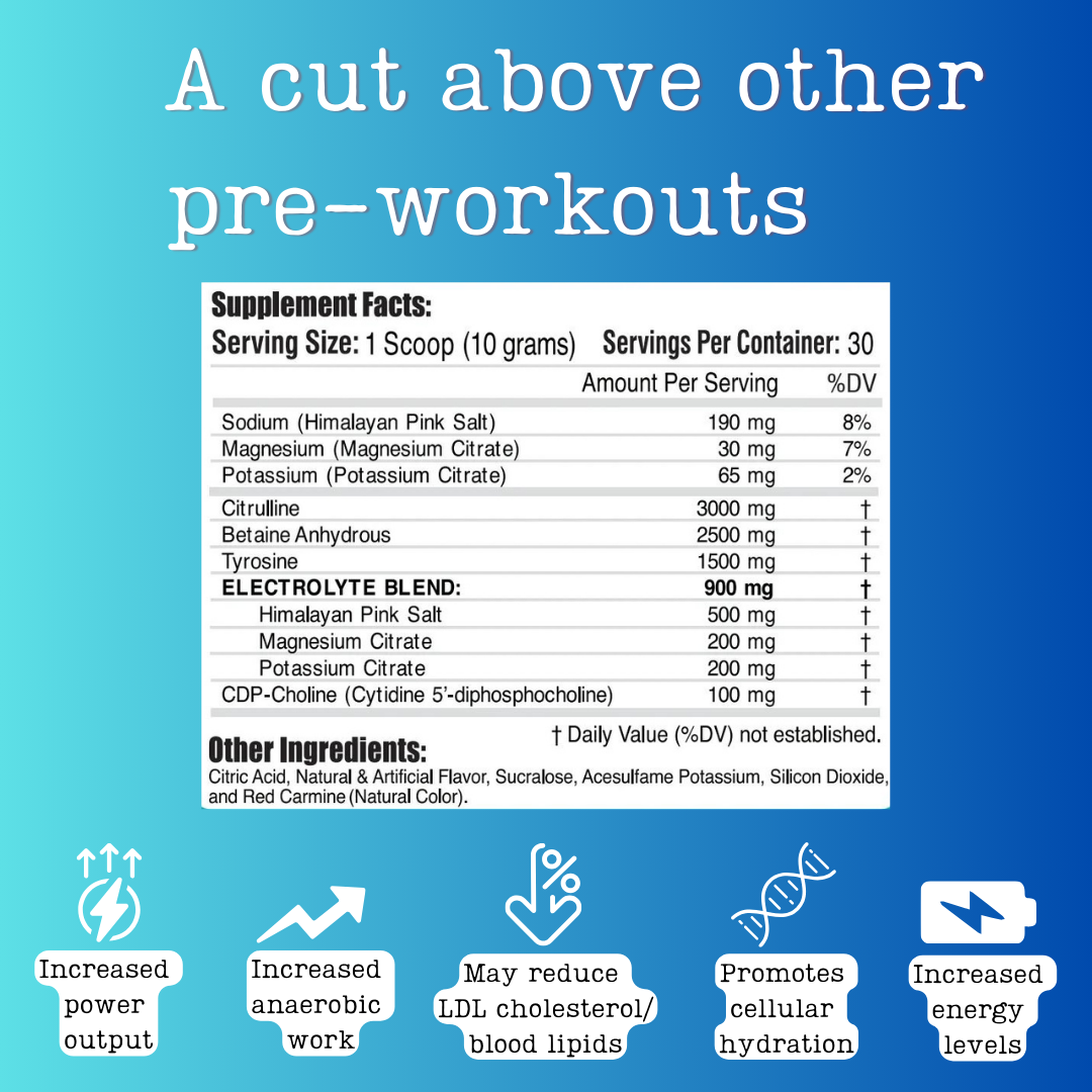 Citrulline, Betaine Anhydrous, Tyrosine, Himalayan Pink Salt, Magnesium Citrate, Potassium Citrate, CDP-Choline