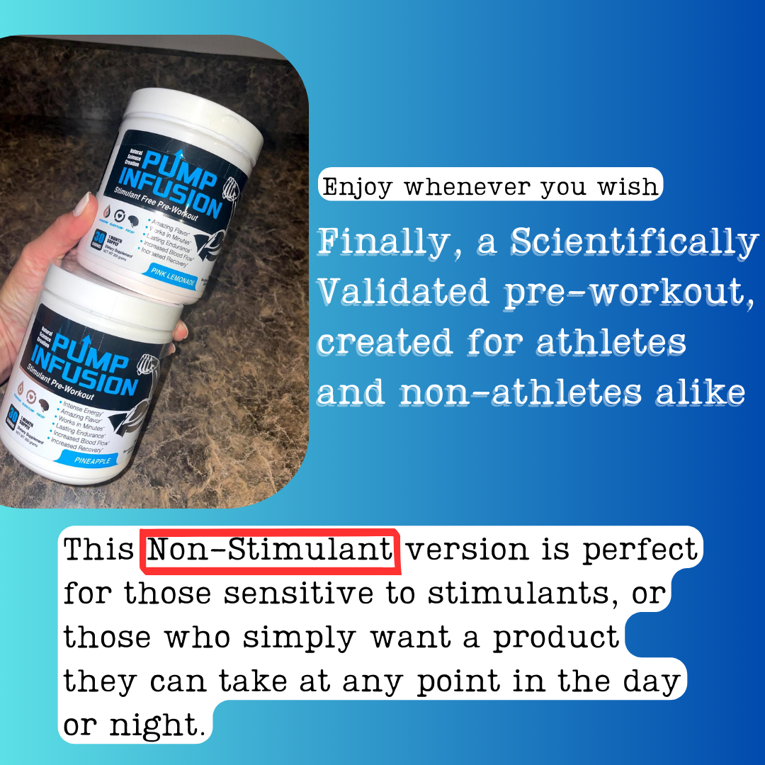 Pump Infusion is a Scientifically Validated pre-workout, created for athletes and non-athletes alike, who are looking for a boost in their workouts. Amplify your pumps and endurance with the clean power of Pump Infusion. This non-stim pre-workout boosts blood flow and focus, fueling your best performance yet. No jitters, just pure, steady energy to crush your goals. Recover quicker and come back stronger every time.