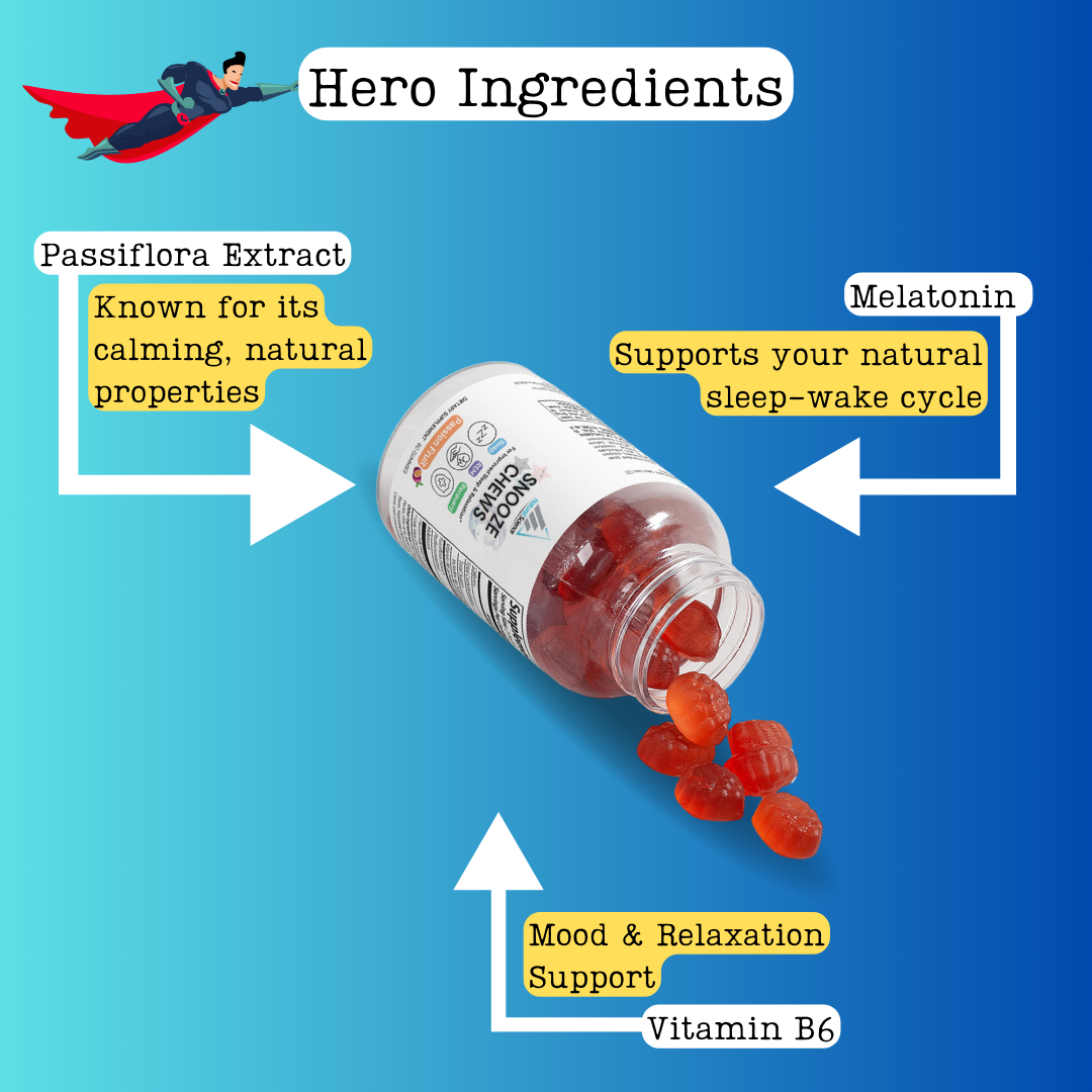 - Melatonin: The body’s own sleep hormone, Melatonin, tells your brain it's time for rest. Snooze Chews contain a balanced dose of Melatonin to support your natural sleep cycle, helping you drift off without the groggy side effects.