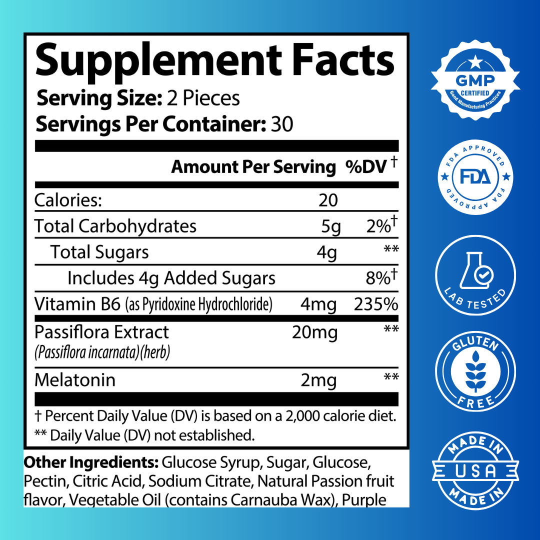 Passiflora Extract (Passiflora incarnate)(herb), Melatonin, Glucose Syrup, Sugar, Glucose, Pectin, Citric Acid, Sodium citrate, Natural Passion fruit flavor, Vegetable Oil (contains Carnauba Wax), Purple Carrot Juice Concentrate (Color).